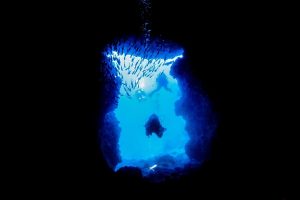 万座オーバーヘッドロック、ドロップオフ(崖)の途中に横に開いたクレパスがあり、そのクレパスの中に入り海側を見てみると横一文字の青のスクリーンが姿を見せてくれます。